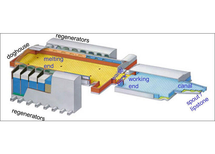 교차 화염 로의 화염 방향은 한쪽에서 다른 쪽으로, 즉 로의 너비를 가로질러 유리 액체의 흐름 방향과 수직입니다.